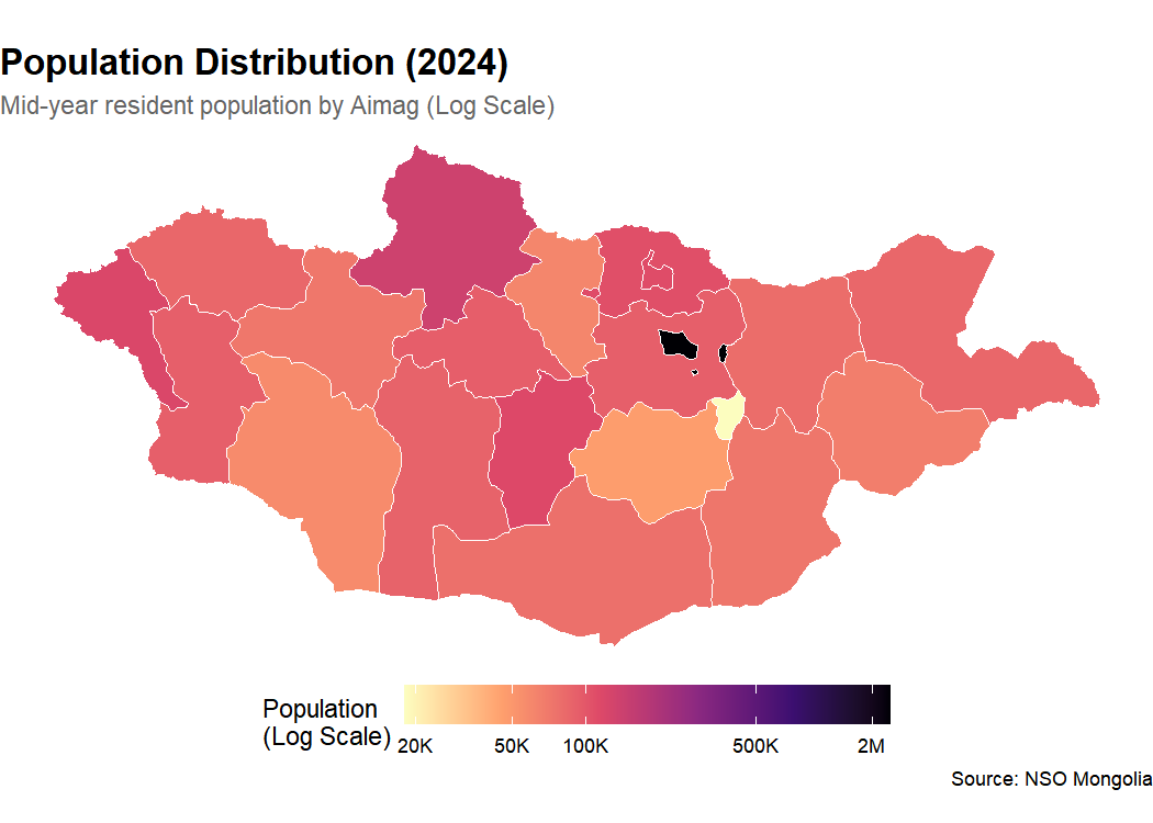 subtitle = "Mid-year resident population by Aimag (Log Scale)",