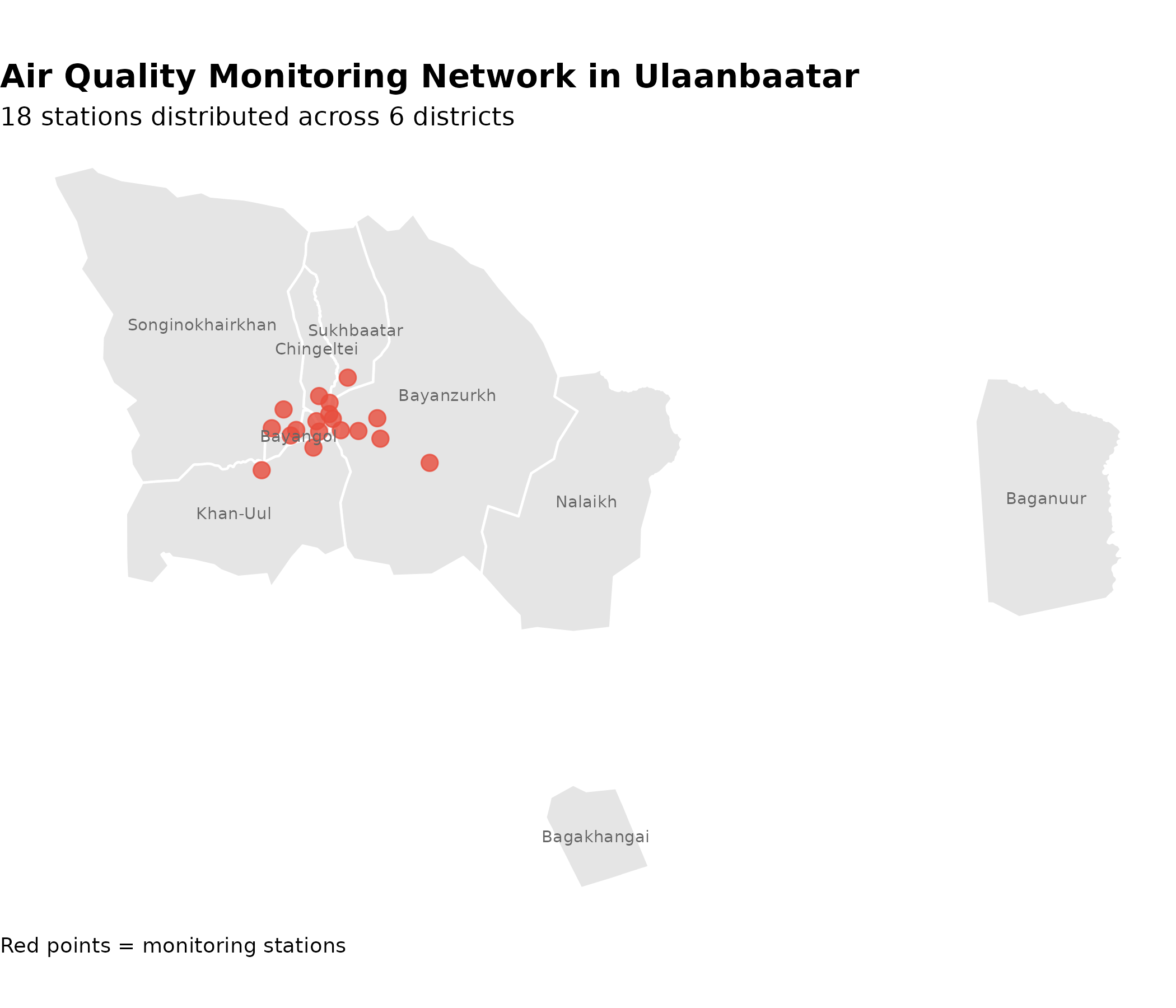 Ulaanbaatar’s air quality monitoring network consists of 18 stations distributed across all districts. Understanding their spatial distribution is critical for interpreting pollution exposure patterns.