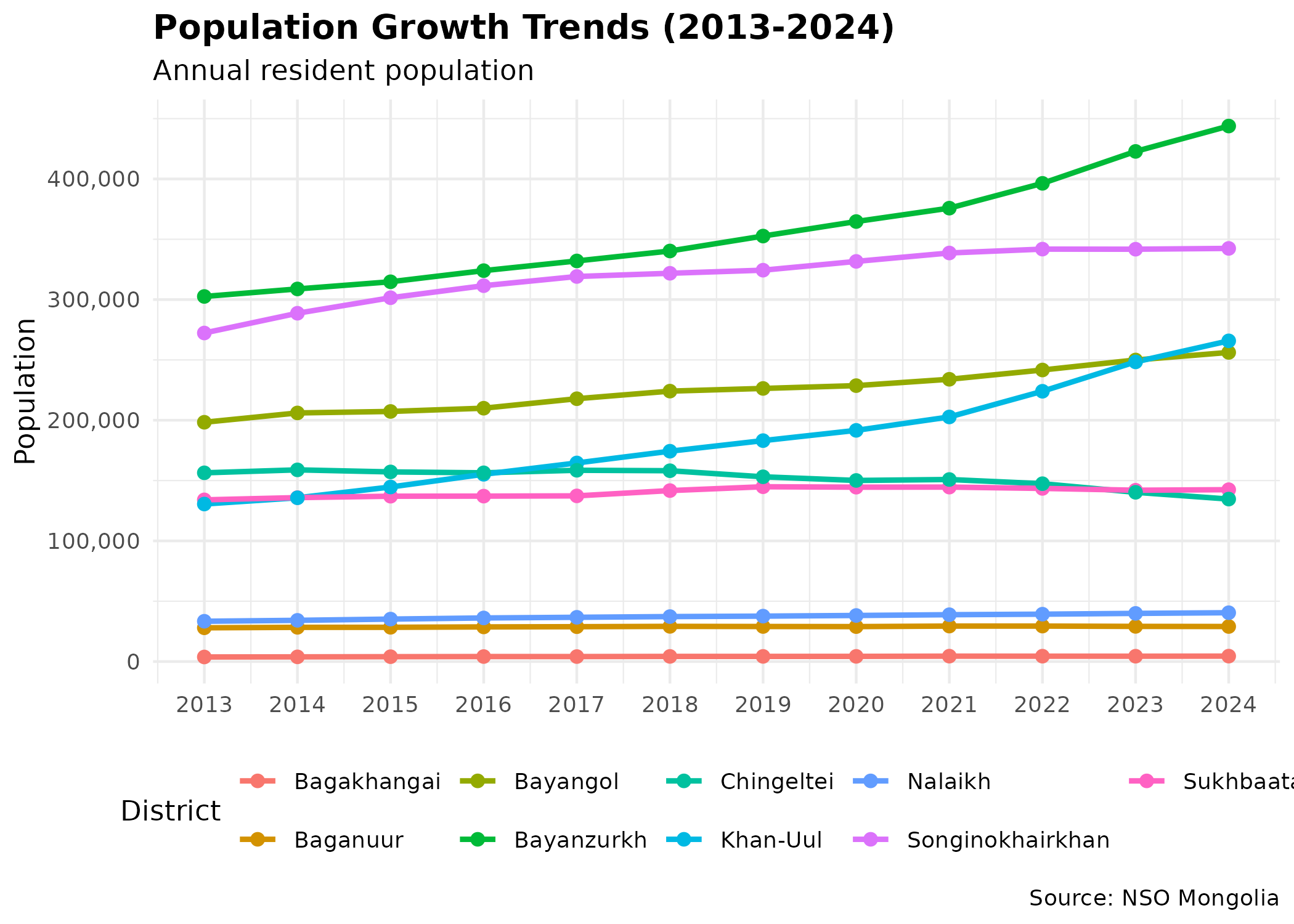 This vignette performs a comprehensive, biostatistical analysis of Ulaanbaatar’s 9 districts (soums), leveraging “by soum” datasets available through the NSO API. We explore demographic shifts, socioeconomic disparities, and public health outcomes, culminating in a multivariate analysis of district-level indicators.