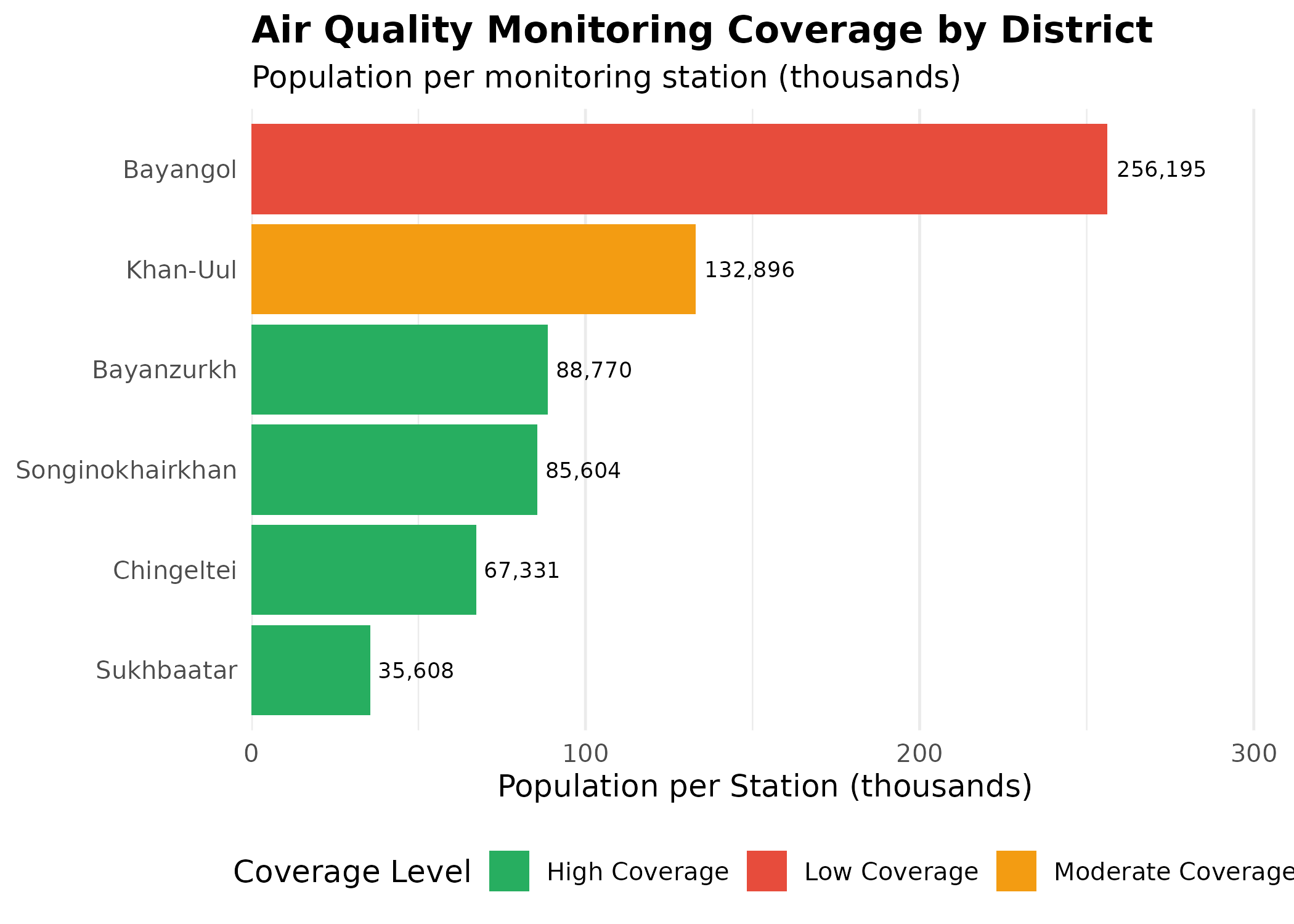 Coverage Disparities: Districts like Bayanzurkh and Songinokhairkhan (despite having multiple stations) still serve large populations relative to station count. This suggests potential spatial gaps in monitoring coverage, particularly in the sprawling ger districts where pollution exposure may be highest but monitoring is sparse.